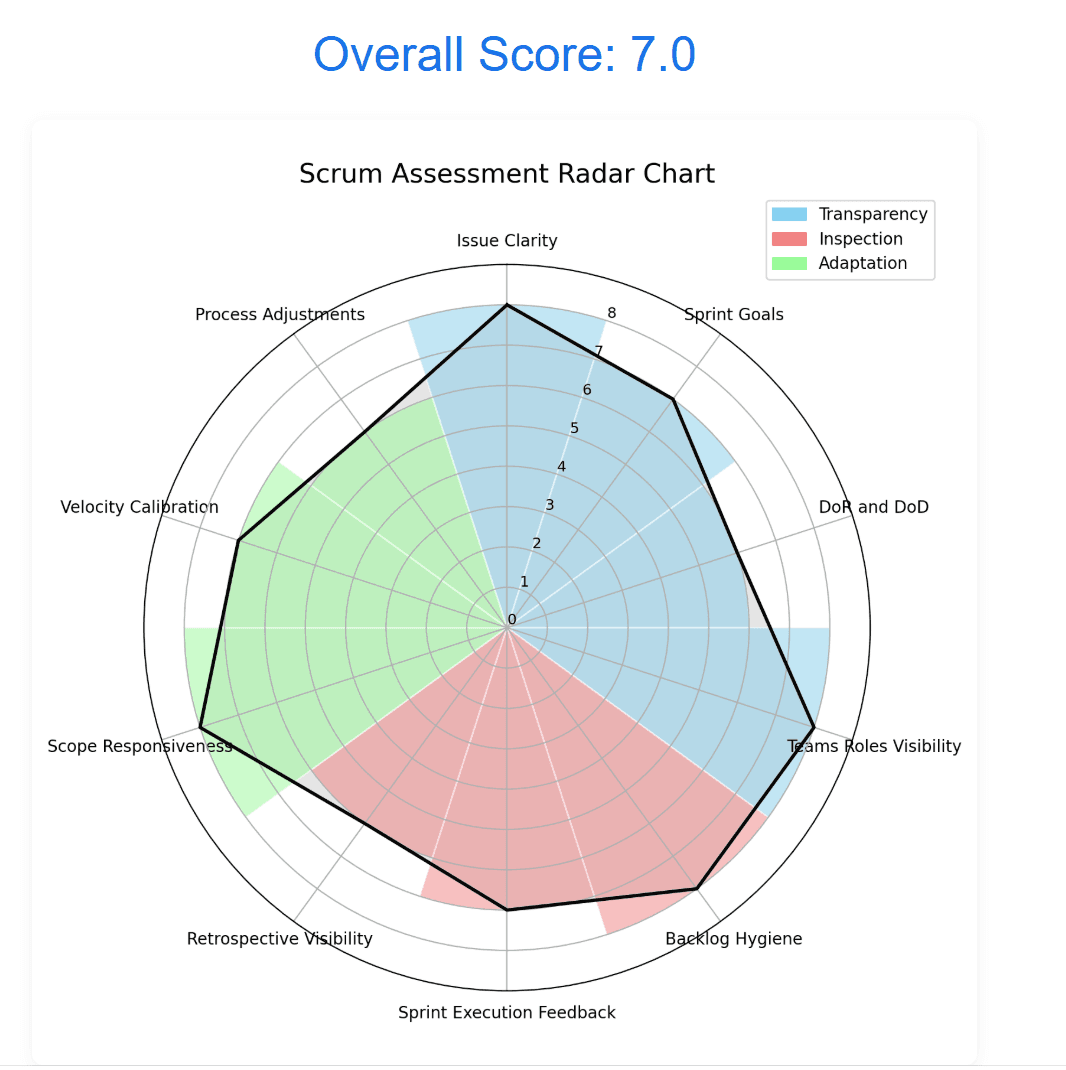 Designed as an independent feature, this report doesn’t require a full Coach Sensai rollout. Just connect your Jira project—and in minutes, you’ll get a clear, structured view of how your team performs across Scrum’s core principles: Transparency, Inspection, and Adaptation.